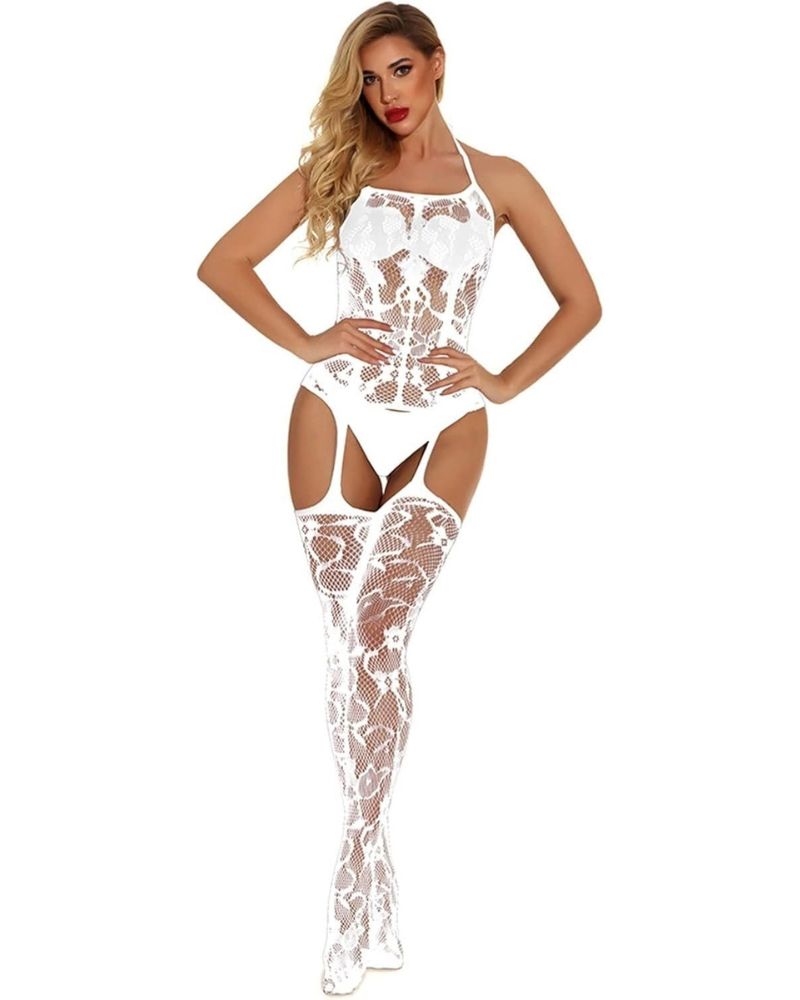 This plus size lace halter bodysuit features a floral lace pattern combined with hollow-out fishnet details that highlight your curves beautifully. The ultra-stretchy nylon and lace fabric fits comfortably on various body shapes, offering softness, breathability, and flexibility for all-night wear.